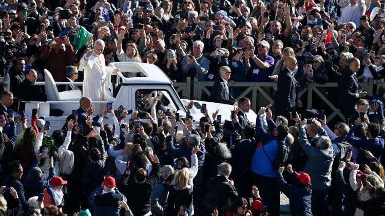 La audiencia, precedida por un recorrido en papamóvil entre abrazos a niños y saludos a los peregrinos, reunió a decenas de miles de personas bajo un cielo soleado en el Vaticano.