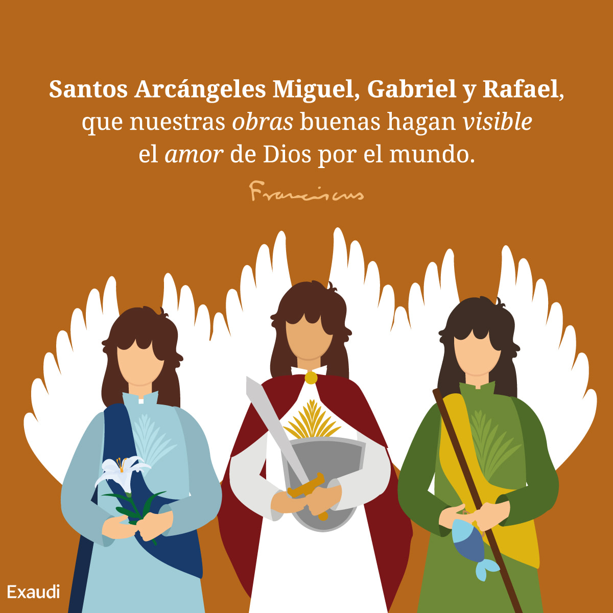 “Miguel, ayúdanos en la lucha: cada uno sabe cuál lucha tiene en su propia vida hoy. Cada uno de nosotros conoce su lucha principal, aquella que pone en riesgo su salvación. Ayúdanos. Gabriel, tráenos noticias, tráenos la Buena Noticia de la salvación, que Jesús está con nosotros, que Jesús nos ha salvado y danos esperanza. Rafael, tómanos de la mano y ayúdanos en el camino para no equivocarnos de camino, para no quedarnos parados. Siempre caminar, pero ayudados por ti”.