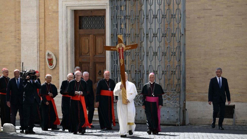 Lo hanno seguito cardinali, vescovi, sacerdoti e laici che lavoravano nei vari dicasteri vaticani. Tutti hanno condiviso questo segno di comunione e conversione, caratteristico dello spirito giubilare. La cerimonia si è conclusa con la celebrazione della Santa Messa presieduta dal Papa all’interno della Basilica.