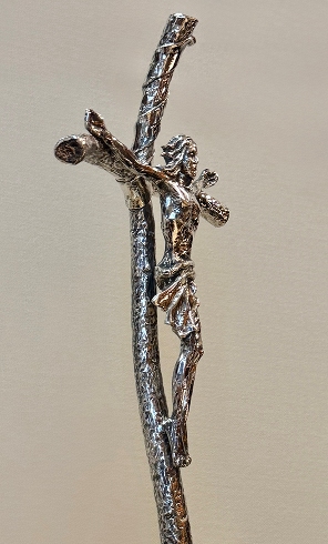 The new crosier of Leo XIV, inspired by the style of Scorzelli, depicts Christ not nailed to the cross but with his glorified body in the act of ascending to the Father. It shows the wounds of the Passion as “luminous signs of victory,” which transform human suffering into the hope of divine life. Furthermore, it bears the papal motto “In illo uno unum” (“In that one, one”), which underscores the unity and ecclesial communion centered on the one Eucharistic Bread.